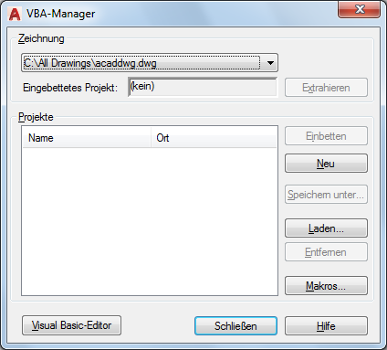 Zeigt den Visual Basic-Editor an, in dem Sie Code, Formulare und Referenzen für jedes geladene VBA-Projekt oder jedes eingebettete VBA-Projekt in einer geöffneten Zeichnung bearbeiten können. Darüber hinaus können Sie Projekte aus dem Visual Basic Editor heraus testen und starten.
