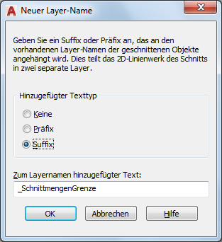 Standardmäßig wird die gesamte Geometrie des Schnittblocks auf Layer 0 (Null) positioniert. Sie können jedoch Präfix- oder Suffix-Beschriftungen festlegen, um das Ordnen der Block-Komponenten wie Schnittmengenbegrenzungen und -füllungen zu erleichtern. Beim Einfügen des Schnittbocks werden seine Komponenten auf neuen Layern positioniert, deren Namen sich aus dem Namen des Layers, der das Schnittobjekt enthält, und dem von Ihnen festgelegten Präfix oder Suffix zusammensetzen. Wenn die Schnittebene Objekte auf zwei oder mehr Layern enthält, werden zwei oder mehr neue Objektlayer erstellt.