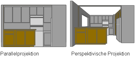Die nachstehende Abbildung zeigt dasselbe Modell in einer Parallelprojektion und in einer perspektivischen Projektion. Beiden Ansichten liegt dieselbe Ansichtsrichtung zugrunde.