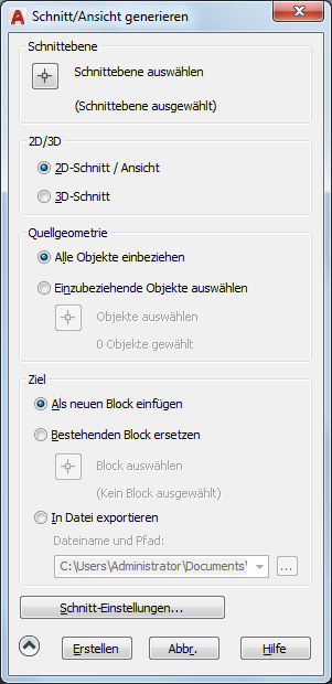 Fügt den erzeugten Schnitt als Block in die aktuelle Zeichnung ein.