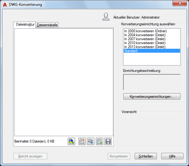 Zeigt eine Liste der Zeichnungsdateien, die Sie konvertieren möchten. Alle Dateien, die konvertiert werden sollen, werden durch ein Häkchen neben dem Dateinamen gekennzeichnet. Klicken Sie mit der rechten Maustaste in den Dateianzeigebereich, um ein Kontextmenü mit mehreren Optionen anzuzeigen.