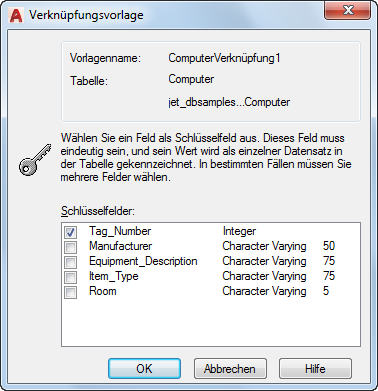 Zeigt alle Felder an, die für die aktuelle Datenbanktabelle zur Verfügung stehen, außerdem den Feldtyp sowie (bei alphanumerischen Feldern) die Feldlänge. Um ein Schlüsselfeld für die Verknüpfungsvorlage festzulegen, aktivieren Sie das Kontrollkästchen links neben dem gewünschten Feldnamen.