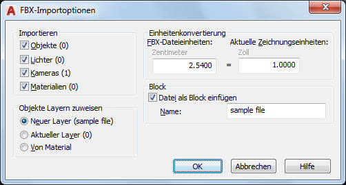 Definiert, was importiert werden soll, wie Layer für die importierten Objekte zugewiesen werden, welche Konvertierungseinheiten verwendet werden und ob die FBX-Datei als Block importiert werden soll.