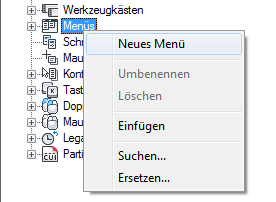 Klicken Sie auf der Registerkarte Anpassen im Bereich Anpassungen in <Dateiname> mit der rechten Maustaste auf den Knoten Menüs. Klicken Sie auf Neues Menü.