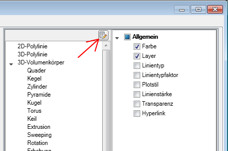 Wenn ein Objekttyp ausgewählt ist, werden die Eigenschaften für diesen Objekttyp in der Schnelleigenschaftenpalette angezeigt, wenn ein Objekt des entsprechenden Objekttyps ausgewählt, QPMODE auf 2 festgelegt und PICKFIRST aktiviert ist. Heben Sie die Auswahl eines Objekttyps auf, wenn dieser Objekttyp aus Schnelleigenschaftenpalette entfernt werden soll.