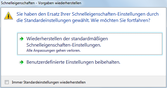 - Klicken Sie auf Wiederherstellen der standardmäßigen Schnelleigenscharten-Einstellungen.