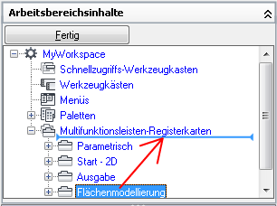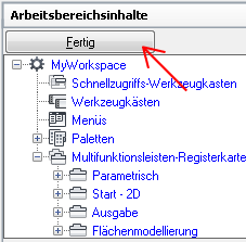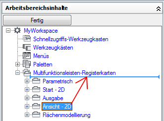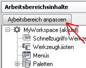 - Klicken Sie auf der Registerkarte Anpassen im Bereich Anpassungen in <Dateiname> auf das Pluszeichen (+) neben dem Knoten Arbeitsbereiche, um ihn zu erweitern.