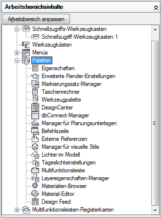 - Klicken Sie im Bereich Arbeitsbereichsinhalte auf das Pluszeichen (+) neben dem Knoten Paletten, um ihn zu erweitern.