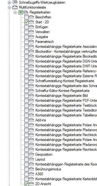 - Aktivieren Sie das Kontrollkästchen neben den Multifunktionsleisten-Registerkarten, die Sie zu einem Arbeitsbereich hinzufügen möchten.