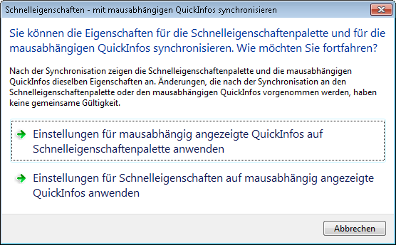 Wenn ein Objekttyp ausgewählt ist, werden die Eigenschaften für diesen Objekttyp in einer mausabhängigen QuickInfo angezeigt, sobald der Mauszeiger über ein Objekt des entsprechenden Typs geführt wird. Heben Sie die Auswahl eines Objekttyps auf, wenn dieser Objekttyp keine mausabhängigen QuickInfos unterstützen soll.