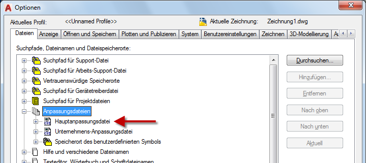 Benutzerprofile sind benannte Sammlungen von Einstellungen für die Anwendung und die Zeichnungsumgebung. Zu diesen Einstellungen gehören die Farbe des Zeichnungsfensters, die Cursorgröße, die Schriftart im Befehlszeilenfenster, das Wörterbuch für die Rechtschreibung usw.
