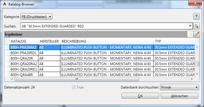 Anmerkung: Unterbaugruppenelemente, wie durch einen Wert für BAUGRUPPENLISTE definiert, werden nicht in die Suchergebnisse aufgenommen. Verwenden Sie den Bearbeitungsmodus des Katalog-Browsers zum Anzeigen und Bearbeiten von Unterbaugruppenelementen.