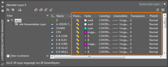 Überschreibungen von Layereigenschaften werden auf das aktuelle Layout-Ansichtsfenster angewendet. Wenn Sie auf ein Layout doppelklicken, um es zum aktuellen Ansichtsfenster zu machen, werden zusätzliche Spalten im Layereigenschaften-Manager angezeigt.