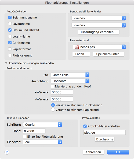 Schreibt die Plotstempelinformationen in eine Protokolldatei. Der Vorgabename der Protokolldatei ist plot.log. Sie befindet sich im Hauptanwendungsordner.