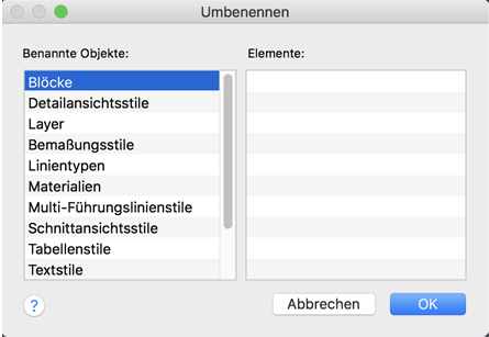 Ändert die Namen, die benannten Objekten wie Layern und Bemaßungsstilen zugewiesen wurden.