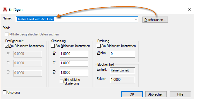 Nach dem Einfügen wird die Blockdefinition in der aktuellen Zeichnung gespeichert. Anschließend können Sie sie in der Dropdown-Liste Name auswählen, ohne auf die Schaltfläche Durchsuchen klicken zu müssen.