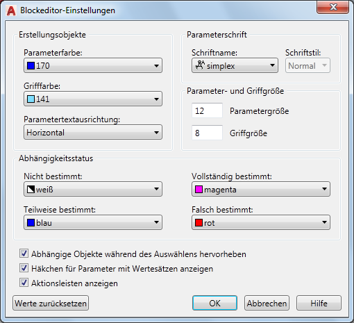 Bestimmt die Farbe des Parameter- und Griffobjekte und legt die Ausrichtung des Parametertexts fest.