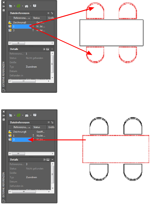 Zugeordnete XRefs sind Verknüpfungen zum Modellbereich einer angegebenen Zeichnungsdatei. Änderungen, die an der referenzierten Zeichnung vorgenommen werden, werden automatisch in der aktuellen Zeichnung wiedergegeben, wenn diese geöffnet wird oder wenn die XRef neu geladen wird. Zugeordnete XRefs erhöhen die Größe der aktuellen Zeichnung nicht erheblich.