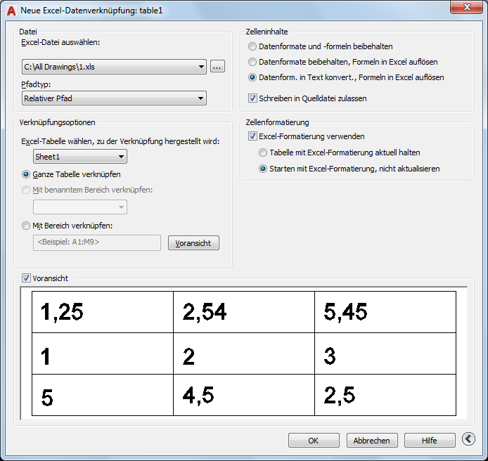 Verknüpft die gesamte Tabelle in der Excel-Datei mit einer Tabelle in der Zeichnung.