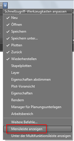 Die Menüleiste kann über die Dropdown-Liste des Schnellzugriffs-Werkzeugkastens oder durch Anpassen der Benutzeroberfläche mit dem Befehl ABI aktiviert werden.