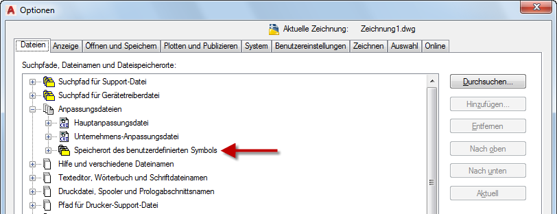 Benutzerprofile umfassen auch die Speicherorte, in denen das Programm nach Support-, Treiber-, Anpassungsdateien und anderen Dateien sucht. Wenn Ihre benutzerdefinierten Dateien nicht an den vorgabemäßigen Speicherorten abgelegt sind, werden die Pfade zu diesen Speicherorten migriert, die benutzerdefinierten Dateien selbst jedoch nicht. Migrieren Sie Ihre benutzerdefinierten Dateien mit den Optionen im Dienstprogramm Benutzerdefinierte Einstellungen migrieren, oder kopieren Sie die Dateien manuell zwischen den Speicherorten der früheren und der aktuellen Version des Programms.