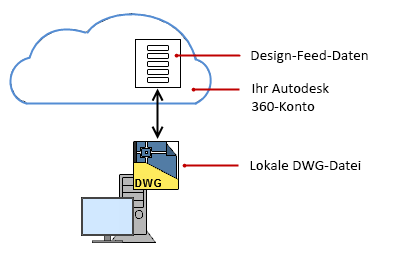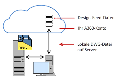 Als Alternative zum Speichern von Zeichnungsdateien in Ihrem A360-Konto können Sie sie lokal auf der Festplatte Ihres Computers speichern. In diesem Fall werden die Design-Feed-Daten für diese Zeichnungen weiterhin in A360 gespeichert, die Zuordnung zu den Design-Feed-Daten wird jedoch durch eine eindeutige Design-Feed-ID verwaltet, das heißt eine in Ihre Zeichnung eingebettete Verknüpfung zu den Design-Feed-Daten.