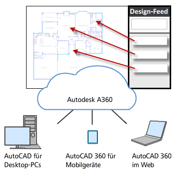 Beim Speichern einer Zeichnung in Ihrem Autodesk A360-Online-Konto werden die zugehörigen Design-Feed-Daten und Bilder sicher in A360 gespeichert.