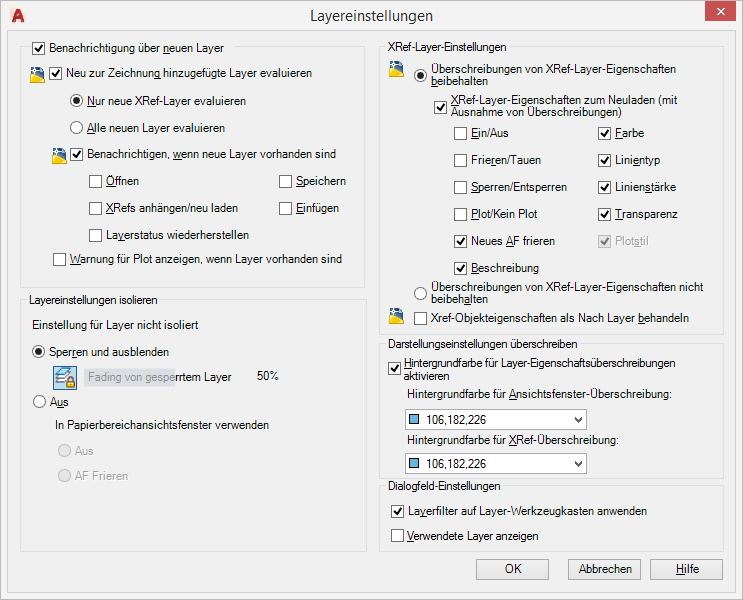 Steuert die Benachrichtigungen für neue Layer, das Layer-Verhalten, wenn einige Layer isoliert werden, ob Layerfilter auf den Layer-Werkzeugkasten angewendet werden, sowie die Hintergrundfarbe für Ansichtsfenster-Überschreibungen im Layereigenschaften-Manager.