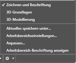 Bei Arbeitsbereichen handelt es sich um Sätze von Menüs, Werkzeugkästen, Paletten und Multifunktions-Steuerungsleisten, die so gruppiert und organisiert wurden, dass Sie in einer benutzerdefinierten, aufgabenbasierten Zeichnungsumgebung arbeiten können.