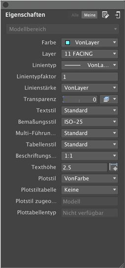 Zeigt die Eigenschaften für die aktuelle Zeichnung oder ausgewählte Objekte an.