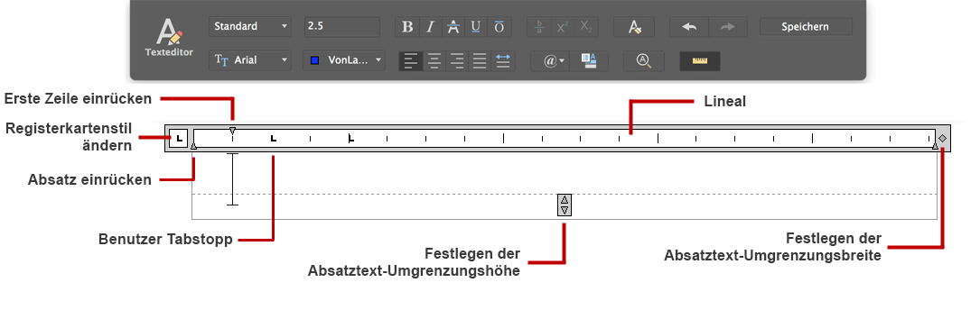 Sie können Text aus anderen Dateien importieren oder einfügen und in Absatztext verwenden, Tabulatoren einfügen, die Absatz- und Zeilenabstände sowie deren Ausrichtung anpassen und Spalten erstellen bzw. ändern.