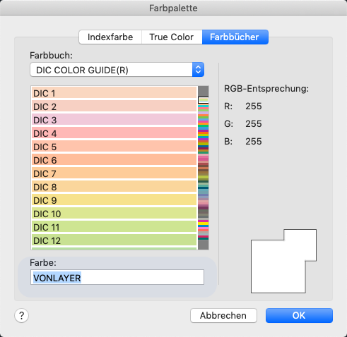Auf der Registerkarte Farbbücher wird der Name des ausgewählten Farbbuchs angezeigt.