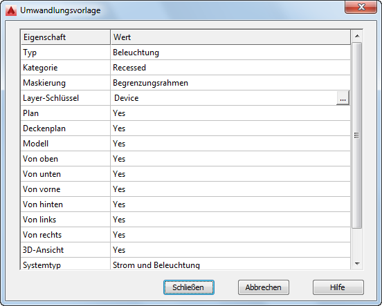 Anmerkung: Wenn Sie Änderungen an der Vorlage vornehmen möchten, bevor Sie sie verwenden, klicken Sie auf Bearbeiten. Nehmen Sie im Dialogfeld Umwandlungsvorlage die nötigen Änderungen an den Werten für die Einstellungen in der Vorlage vor. Klicken Sie auf Schließen, um zum Dialogfeld Geräteumwandlungs-Skript zurückzukehren.