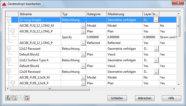 Die Eigenschaft Category (Kategorie) im Skript wird im Stil-Manager nicht angezeigt. Gerätekategorien dienen zum Gruppieren der Geräte (Gerätestile) im Arbeitsblatt Gerät auswählen. Dies erleichtert das Durchsuchen der verfügbaren Geräte. Gerätekategorien werden direkt im Arbeitsblatt erstellt und verwaltet. Weitere Informationen finden Sie unter "Erstellen von Kategorien in AutoCAD MEP".