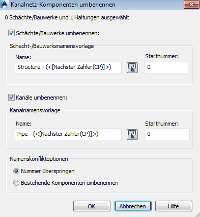 Komponenten umbenennen Sie können auswählen, ob nur Haltungen, nur Schächte/Bauwerke oder beides umbenannt werden soll.