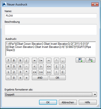 Der Haltungsradius (Pipe Radius) wurde durch den Ausdruck ((Start Crown Elevation – Start Invert Elevation)/2) ersetzt. Die Verwendung des Haltungsradius, einer benannten Komponente der Haltung, funktioniert in diesem Fall nicht fehlerfrei. Verwenden Sie auch nicht die Komponente {Inner Pipe Diameter}.