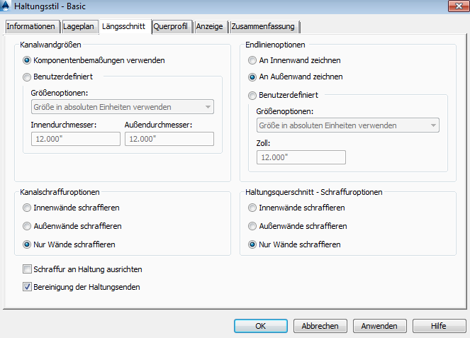 Verwenden Sie die Option Bereinigung der Haltungsenden im Dialogfeld Haltungsstil (siehe Abbildung 4), um das Erscheinungsbild von Haltungslängsschnitten so zu optimieren, dass die Haltungen grafisch wie gewünscht angeordnet sind. Diese Option ist nicht standardmäßig aktiviert, Sie müssen sie auswählen.