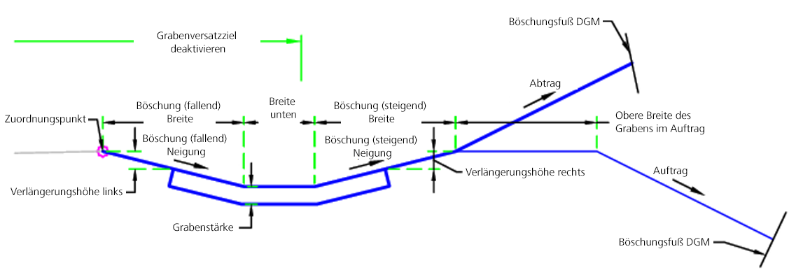 | Graben auslassen | Kann verwendet werden, um den Bau des Grabens zu deaktivieren. Folgende Objekttypen können beim Festlegen des Versatzes als Ziele verwendet werden: Achsen, Polylinien, Elementkanten oder Vermessungslinienzüge. | Optional |