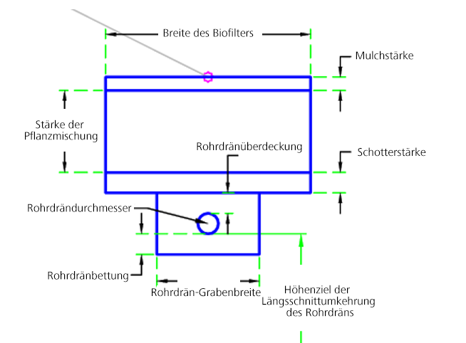 Der erste Punkt wird am Zuordnungspunkt angesetzt. Der Querschnittsbestandteil erstellt eine Mulchschicht gefolgt von einer Pflanzmischungsschicht und einer Kiesschicht. Wenn festgelegt wurde, dass ein Rohrdrän eingeschlossen werden soll, erstellt der Querschnittsbestandteil ein Rohr und eine Bettung für den Rohrdrän.
