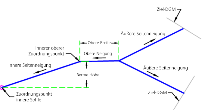 Der Zuordnungspunkt befindet sich an der inneren Sohle oder inneren Oberkante der Berme. Diese Komponente kann entweder der linken oder der rechten Seite zugeordnet werden.