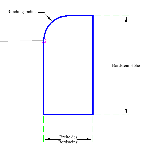 Der Querschnittsbestandteil erstellt die Profilart für einen einfachen Bordstein mit Radius, wobei der Zuordnungspunkt am unteren Radius des Bordsteins liegt.
