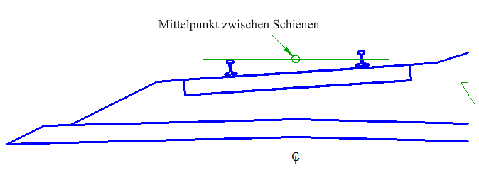Der Zuordnungspunkt befindet sich an der Mittellinie zwischen den Schienen der linken Spur. Die Spuren können relativ zu diesem Punkt mithilfe der Parameter des Querschnittsbestandteils verschoben werden.