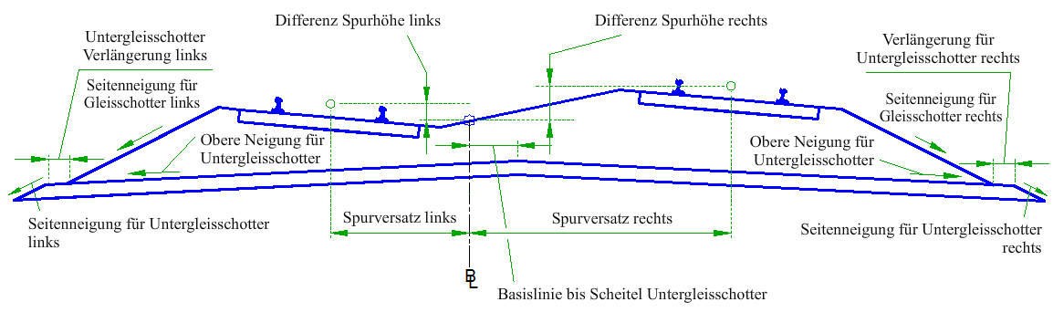 Die obere Neigung der linken und rechten Seite des Untergleisschotters mit der Mittellinie des Querschnittsbestandteils als Anschlusspunkt. |