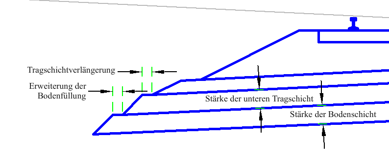 Er sollte von einem Böschungsfuß-Querschnittsbestandteil an der linken und rechten Seite gefolgt sein, um das bestehende Gelände in Abtrags- und Auftragssituationen zu schließen. Dabei kann auf Schienenüberhöhungen reagiert werden.