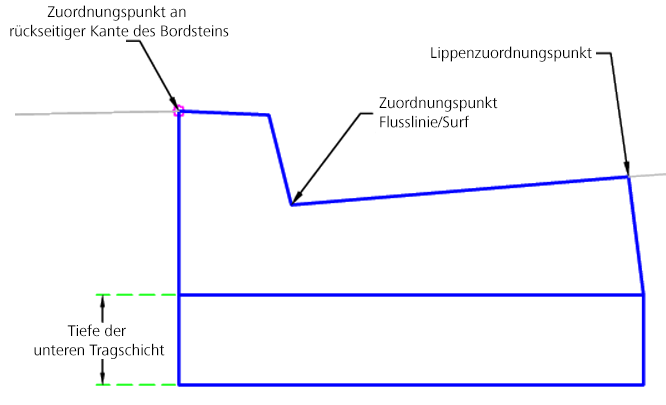 Die Bord- und Rinnsteinverknüpfungen werden basierend auf den im Querschnittsbestandteil gespeicherten Werten eingefügt. Alle Bemaßungen sind positiv und ungleich Null. Wird eine untere Tragschichttiefe ungleich null angegeben, wird die untere Tragschicht nicht eingefügt. Die untere Tragschicht schließt zur rückseitigen Unterkante des Bordsteins ab.