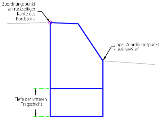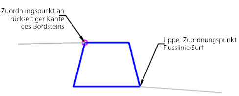 Der Zuordnungspunkt befindet sich am Auskragungspunkt des Rinnsteins, an der Rückseite des Bordsteins oder an der Fläche des Bordsteins.