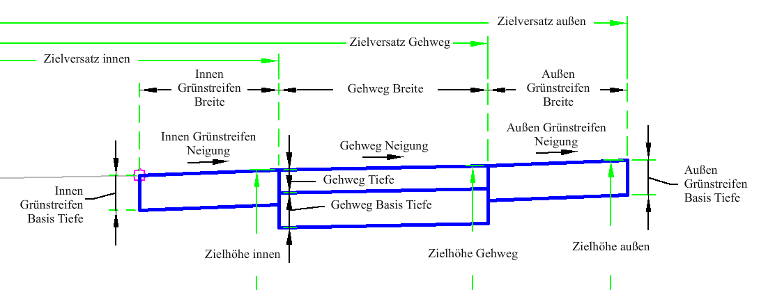 | Innen Grünstreifen Breite | Kann zum Überschreiben des festen Werts für Innen Grünstreifen Breite und zum Binden des Gehweginnenrands an eine Achsparallele verwendet werden. Folgende Objekttypen können beim Festlegen des Versatzes als Ziele verwendet werden: Achsen, Polylinien, Elementkanten oder Vermessungslinienzüge. | Optional |