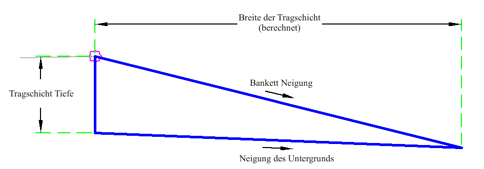 Das Bankett wird für die angegebene Banketttiefe und Bankettneigung sowie den angegebenen Bankettuntergrund eingefügt. Die Breite wird berechnet, wobei sich die Bankettneigung und der Bankettuntergrund schneiden. Anschließend werden die Punkte, Verknüpfungen und Profilarten berechnet.