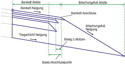 Die Deckschicht des Banketts wird für die vorgegebene Bankettbreite und mit der Vorgabebankettneigung vom Zuordnungspunkt aus nach außen eingefügt. Die Tragschichtverknüpfung wird vom Zuordnungspunkt zu UntereTragschicht Tiefe unterhalb der Deckschicht eingefügt.