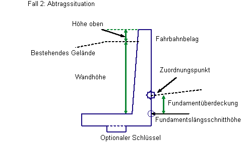 | FundamentÜberdeckung | Die Tiefe der Überdeckung vom oberen Ende des Fundaments bis zur Oberkantenneigungslinie auf der Wandrückseite im Auftrag oder bis zum Ansatz im Abtrag. | Numerisch |